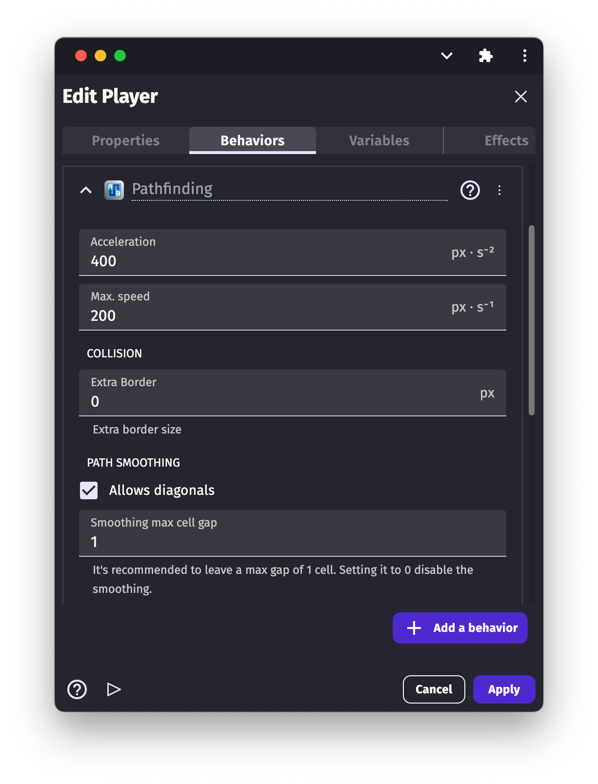 To initiate a pathfinding move, add the action "Move to a position" and specify the location you want the object to move to. It will move using the characteristics defined in the behavior properties. If you want to change how the object moves during the game, these properties can be changed using actions.