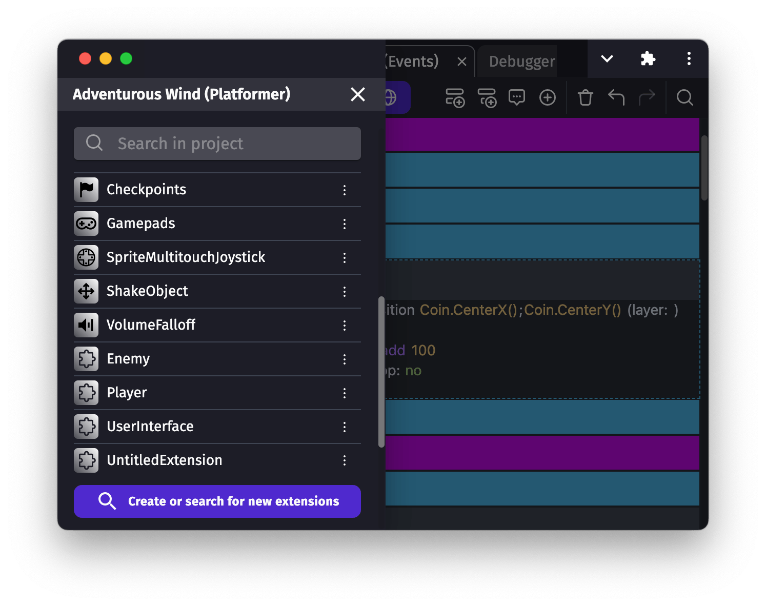 Finding new behaviors, conditions, actions or expressions for your game in GDevelop is easy. In the Project Manager, click on Create or search for new extensions:
