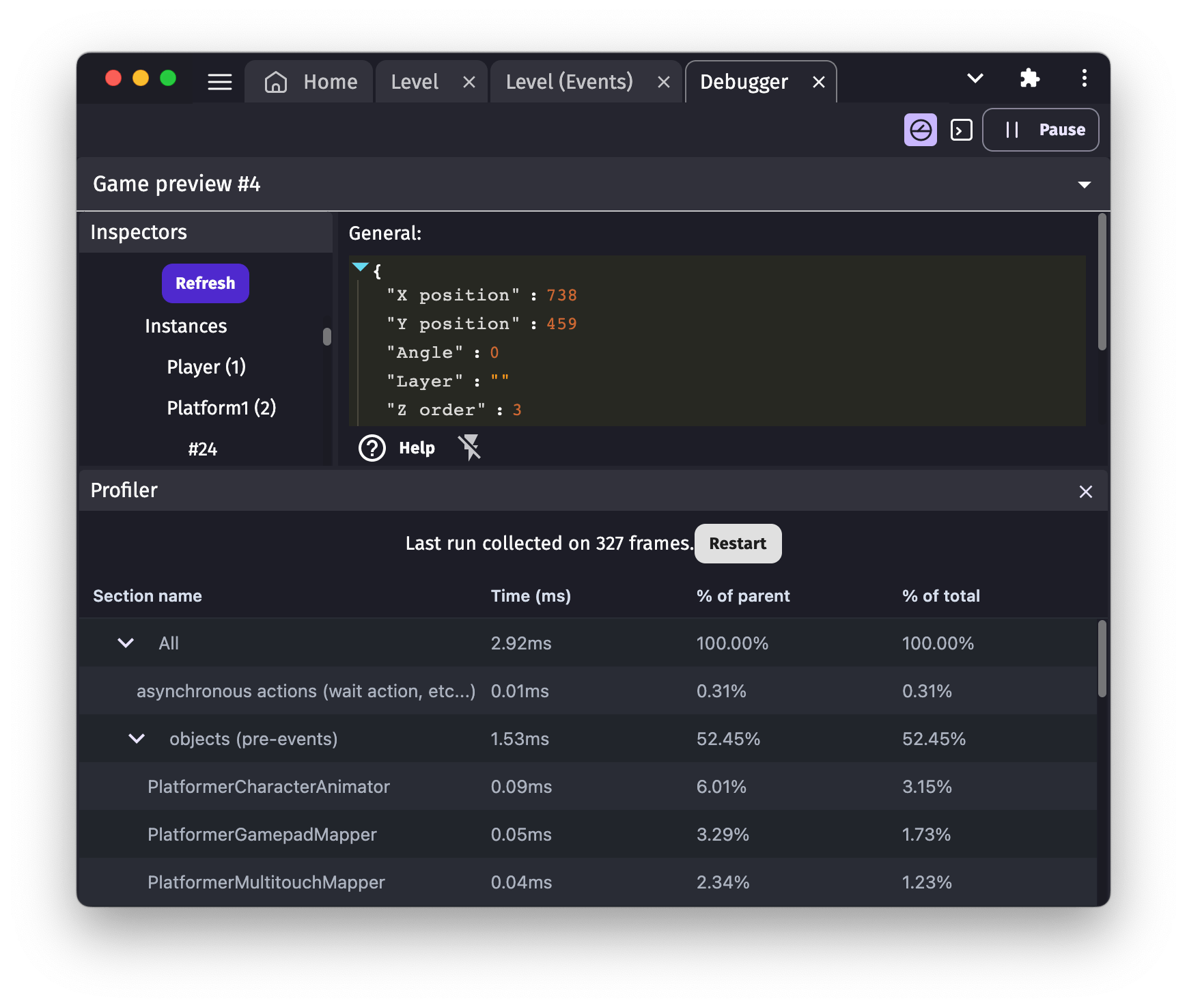 The Profiler is a tool that measures the time spent on different aspects of your game while it is running. It helps to find bottlenecks between your events and the rendering of the game that could be taking up a lot of resources.