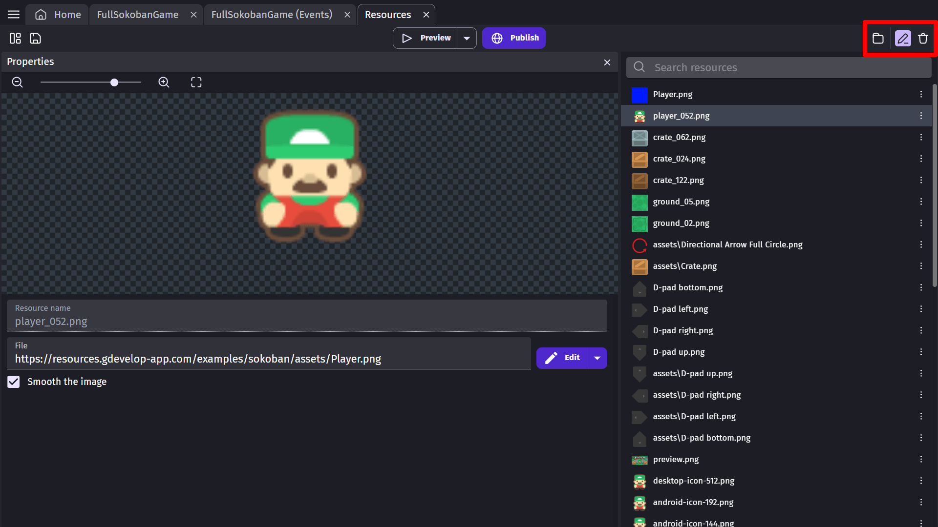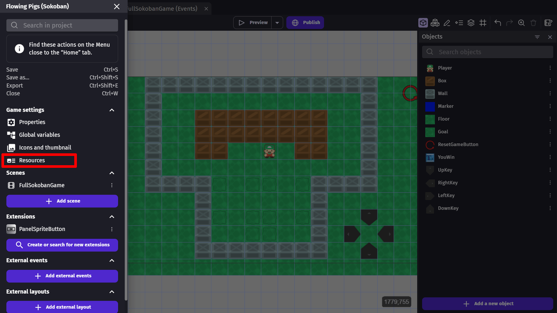 When you click on Resources, a new tab is opened where you can edit and control the resources in your game, all the resources in this new tab will be exported during the export of the game.