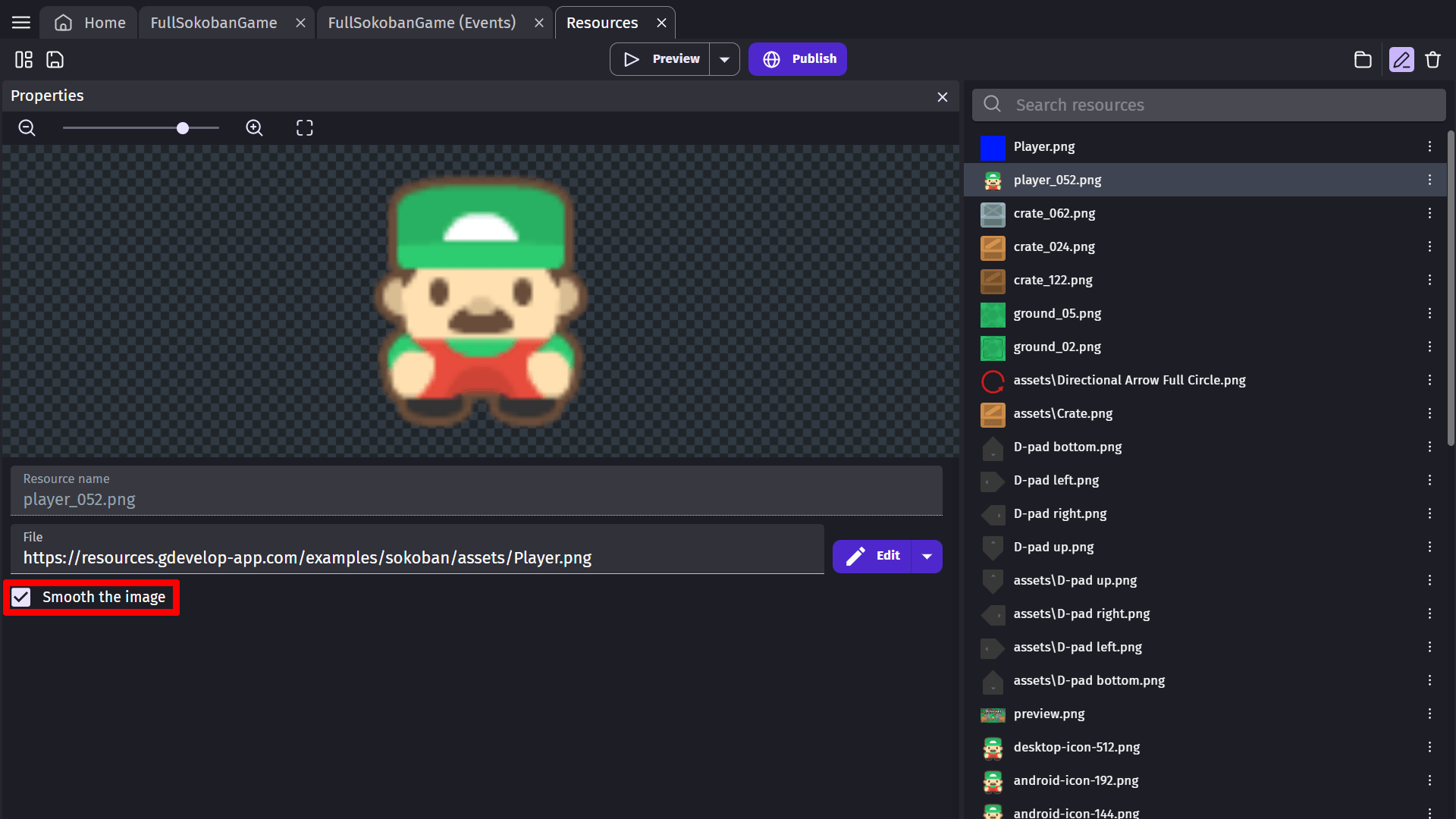 Images can appear blurry if they're scaled to a ratio they were not meant to be, or scaled at the correct ratio but to the wrong size. Image smoothing can help with scaling in any game that does not use pixel art. You can disable/enable image smoothing by toggling the option Smooth the image for the object that is selected in the resource tab. When your project properties scale mode is set to linear, all assets added to the project will start with this toggled on. But if scale mode is set to nearest, all assets added to the project will start with this toggled off.