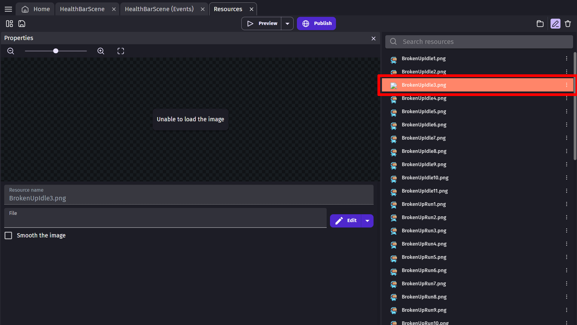If a resources file path is missing, or the file path in your project doesn't lead to an appropriate file inside the project folder, that resource will have a broken image icon and when selected will be highlighted with a different color than other resources in the project.