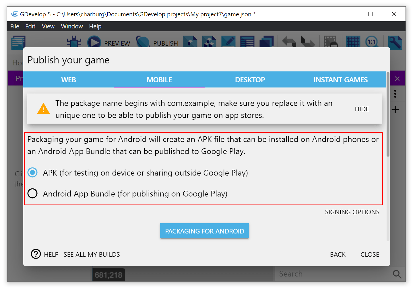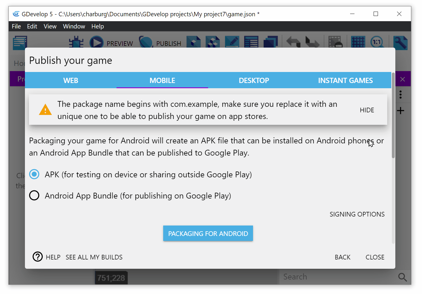 Once you are ready, click on Package for Android. Now, wait for the game to be built. There are a few steps, during which the game is exported, compressed, uploaded to the online build service and built.
