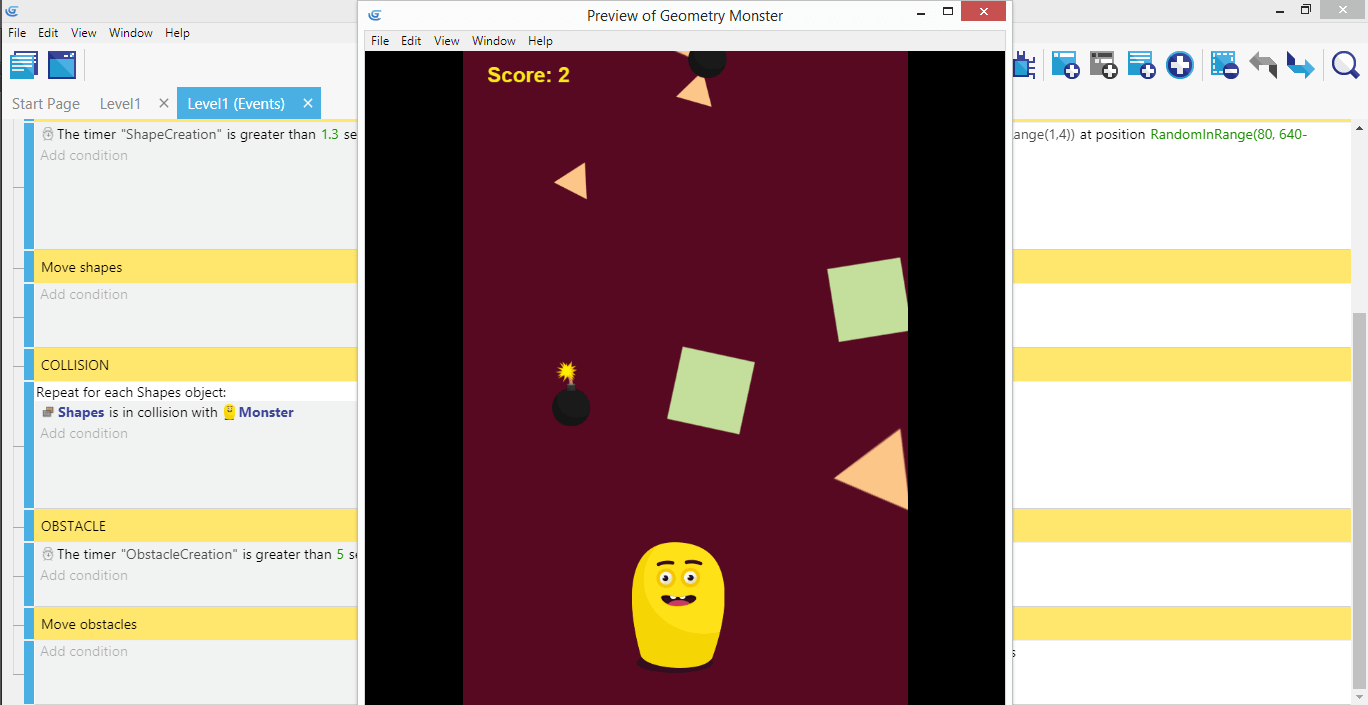 Launch the game and see the shapes falling down the screen, with bombs appearing once every few shapes and falling independently. Collecting shapes give you points, while bombs do nothing yet.